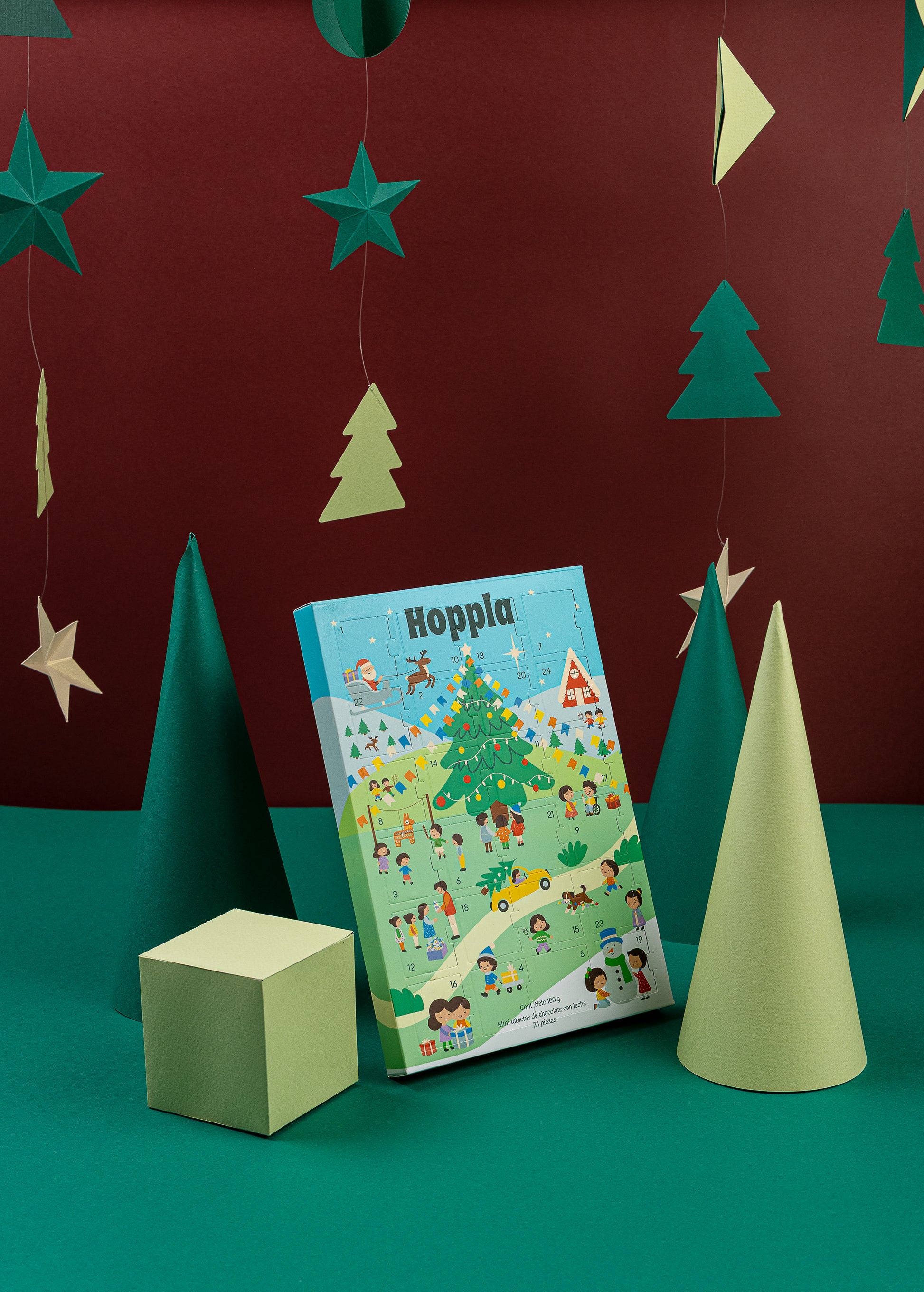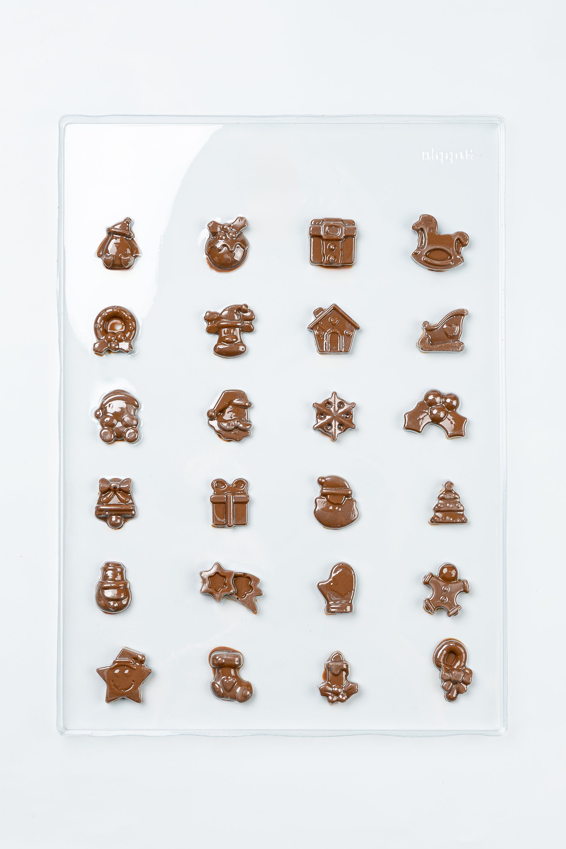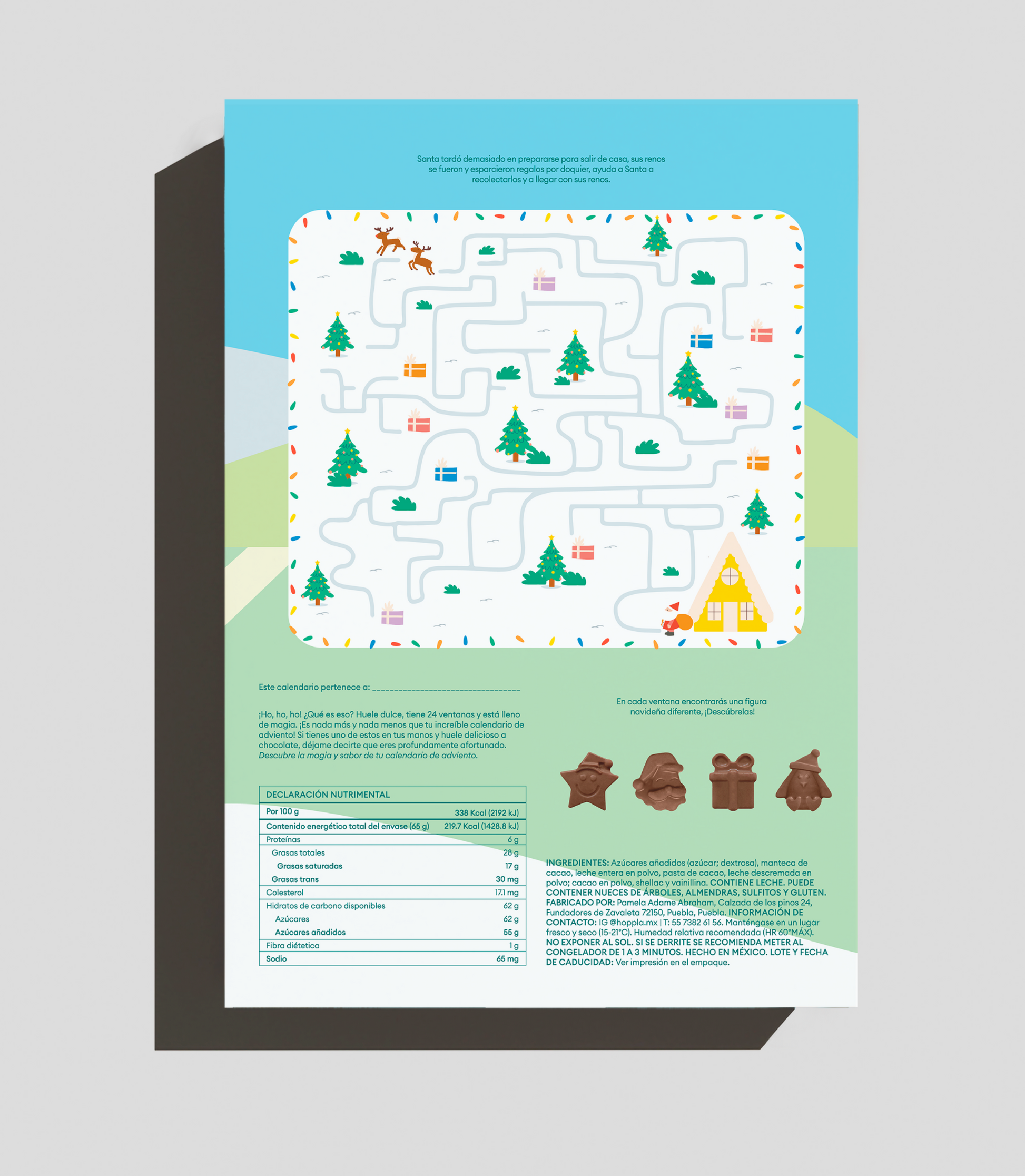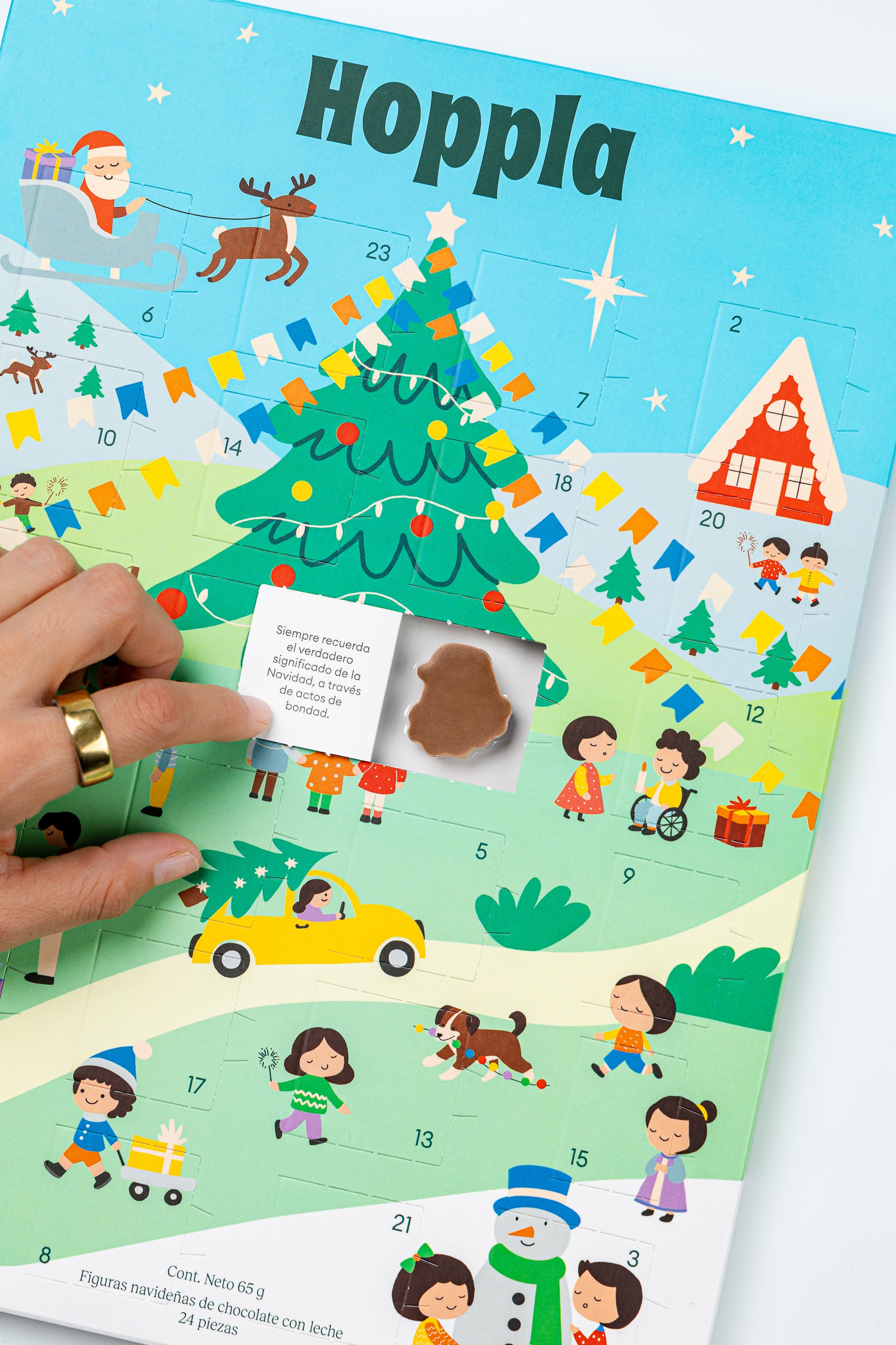 Calendario de Adviento con 24 diferentes figuras navideñas de chocolate con leche. Mensajes personalizados en cada ventanita.